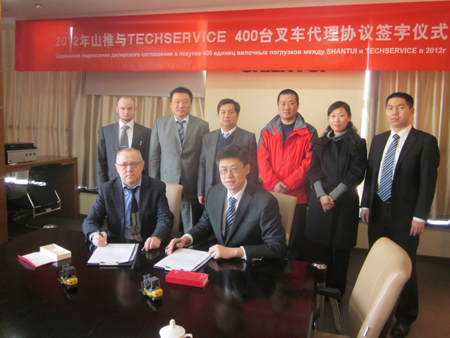2月25日,山推叉车俄罗斯市场400台销售代理协议在北京签订,俄方TECHSERVICE公司代表Sergey A.Kudrin和Alexey BRYZGALOV,公司副总经理兼营销事业部总经理万国全、营销事业部副总经理朱大海、山推股份进出口公司副总经理郭志强等领导及相关人员出席签约仪式。郭志强主持签约仪式。