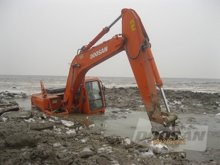 2012年2月12日傍晚,正在山东滨州某处结冰的海面上施工的2台DH225和1台DH220,由于涨潮陷入到海水中。当不知所措的客户向斗山服务中心寻求帮助时,斗山维修人员朱礼峰、许守辉和机动班专家隋维良在向客户简单交待注意事项后,迅速赶赴抢险现场。