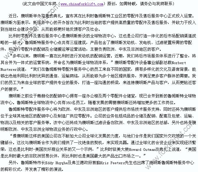 关于康明斯 康明斯是全球领先的动力设备制造商,设计、制造和分销包括燃油系统、控制系统、进气处理、滤清系统、尾气处理系统和电力系统在内的发动机及其相关技术,并提供相应的售后服务。康明斯总部设在美国印第安纳州哥伦布市,在全球各地的员工达到了四万多人。公司通过其遍布全球190多个国家和地区的600家分销机构和6000多个代理商网点向客户提供服务。康明斯2010年销售额132亿美元,净收益10亿美元。