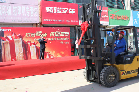 奇瑞叉车位于芜湖高新技术产业开发区园内,是奇瑞重工的重要板块之一,目前已开发出1-16吨内燃叉车、1-3.5吨电动叉车、电动托盘车、电动堆高机等系列叉车产品。奇瑞叉车以汽车的理念制造叉车,做中国最具性价比的叉车产品。活动现场,奇瑞叉车副总经理周俊峰先生和潍坊隆顺总经理先生先后上台致辞。随后,奇瑞叉车山东片区经理姚志勇先生详细介绍了奇瑞叉车产品特点,吸引了与会嘉宾争相试驾,当场签售三十余台。