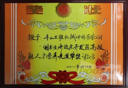 2012年3月29日,在开发区新时代大厦二楼大会议室召开的2012年度第一次劳资例会上,对烟台开发区高技能人才培训工作先进单位及个人进行了表彰。斗山工程机械(中国)有限公司荣获“高技能人才培养工作先进单位”称号,劳资负责人李英荣获“高技能人才培养工作先进个人”称号。