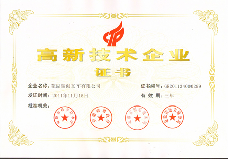 奇瑞叉车公司自成立以来,在以总经理陈学祥先生为首的经营团队带领下,坚持自主创新,开发出多吨位的工业物流机械产品,通过几年来的研发创新与积累,凭借雄厚的技术实力及丰富的实践经验,得到了国家和安徽省的充分肯定和支持。奇瑞叉车此次被认定为高新技术企业,体现出社会对奇瑞叉车科技创新和研发实力的肯定,同时是政府对公司前期艰苦付出的一种肯定,也将为公司今后的发展提供更加良好的外部环境和条件,作为高新技术企业,奇瑞叉车将秉承“科技改变世界,智造成就未来”使命,更加重视技术创新、管理创新与服务创新,依托高新技术、规模经营、科学化管理提高企业抗风险能力,并加快前进步伐,在取得快速发展的同时进一步提升核企业心竞争力,在叉车行业中纵横驰骋,成为叉车行业先锋!