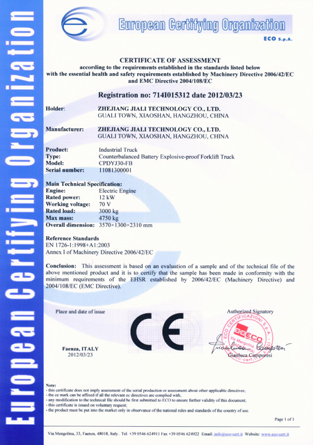 全液压防爆交流电动叉车获欧洲CE认证证书