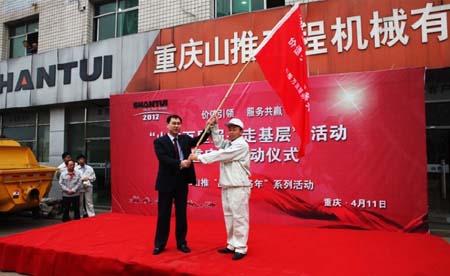 4月11日,山推“万里服务走基层”营销主题活动在重庆启动。仪式上,全体服务人员高喊“全力以赴,保障有力,价值引领,服务共赢”的誓言,高举象征山推服务理念的大旗,浩浩荡荡开赴一线施工现场,拉开了重庆山推“万里服务走基层”活动的序幕。