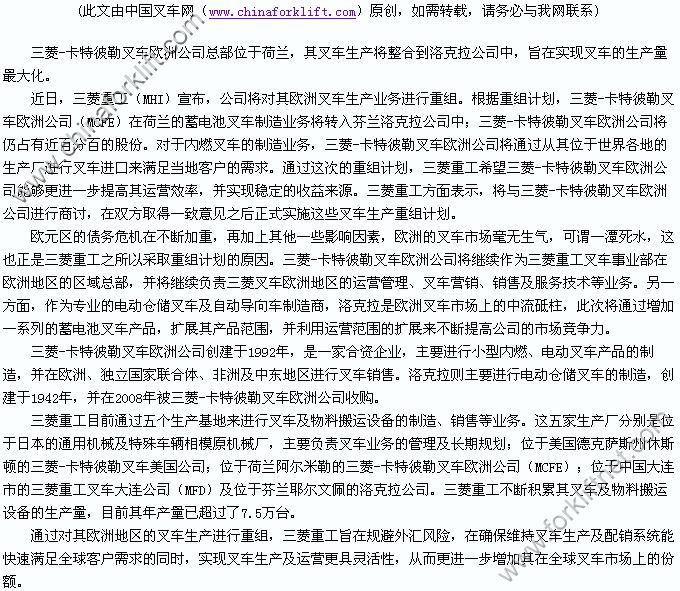 三菱重工和三菱卡特彼勒叉车(美洲、欧洲、亚洲),是全球最主要的叉车厂商之一,拥有数十年的叉车制造经验以及遍及世界的销售服务体系,以5万台/年以上的产量和傲视同业的卓越技术引领物流标准数十年。20年来孜孜不倦致力于支持中国叉车制造业的发展,更使之成为中国用户可信赖的合作者。在此基础上为贴近中国市场,为中国用户提供快捷高效的服务,于2004年3月24日成立菱重叉车(上海)有限公司。