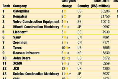 《国际建设》编辑Chris Sleight说:“去年全球销售旺盛的驱动力是欧洲、北美和日本工程机械市场的反弹。中国的一些大的制造商也获得了一些增长,但是他们却经历了十多年以来最具威力的一次顶头凤,即政府刺激性投资项目的终结。在接下来的12个月中,北美市场的持续复苏将对2013年的Yellow Table排行榜起到决定性作用。