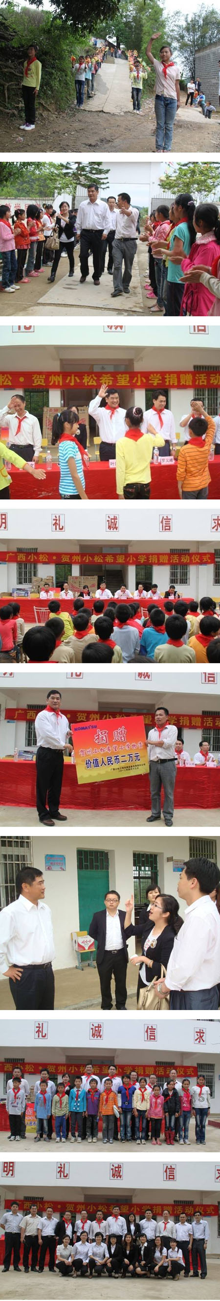 (人力资源部-覃韫)2012年4月13日,业盛集团董事长叶凤琦、广西小松总经理丁勇、人力总监丁德文及公司部分优秀员工代表一行21人,带着公司的慰问和祝福,长途跋涉来到贺州市八步区铺门镇小松希望小学,参加“广西小松•贺州小松希望小学捐赠活动仪式”,受到了贺州市八步区教育局、团委、铺门镇相关领导干部和希望小学全体师生的热烈欢迎。