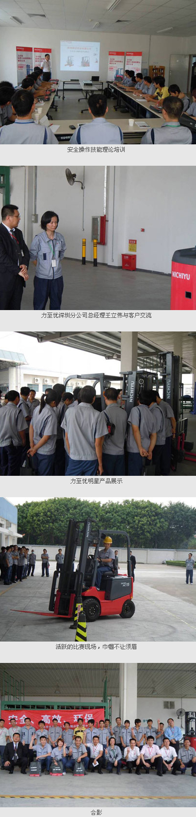 2012年4月26日,力至优客户巡展马不停蹄来到深圳市,深圳是力至优南方大区总部所在地,该站活动得到力至优叉车(上海)有限公司深圳分公司的全力支持。深圳分公司总经理王立伟先生出席巡展活动。 在这里,力至优走进了深圳津村药业有限公司,一家著名的日资企业。主要进行药材的二次加工生产。客户目前厂区内所有电瓶叉车均为力至优的产品。对于力至优的到来表示热烈欢迎。 力至优叉车作为一家日资品牌的叉车生产制造厂家,非常重视客户对产品使用的意见和提供给客户贴心的服务。本次客户巡展更好的送服务到客户,帮助客户更安全更舒适更高效的使用电瓶叉车。