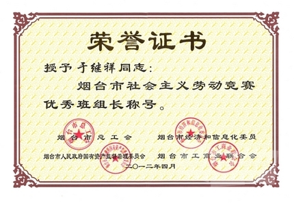 4月27日,在烟台市社会主义劳动竞赛先进班组的评选中,生产2部2课4职1组被评为“社会主义劳动竞赛先进班组”,组长于继祥被授予了“社会主义劳动竞赛优秀班组长”,于继祥作为获奖代表上台领取了证书。