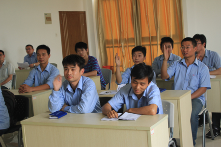 “请听题,我们开发的二代车在结构上有哪些突破和提升?”“如何为我们的用户提供最便捷有效的服务?……”5月8日上午,在奇瑞叉车培训教室里开展了一场气氛热烈而又严肃的销售业务知识答辩会,20名新员工正在接受近十天理论培训的检验。