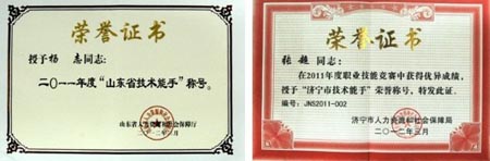 2011年度,在济宁市举办的第四届职工职业技能大赛中,山推推土机事业部张超、传动事业部杨志两名同志分别被济宁市人力资源和社会保障局授予“济宁市技术能手”荣誉称号。同时,杨志同志被山东省人力资源和社会保障厅授予“山东省技术能手”荣誉称号。