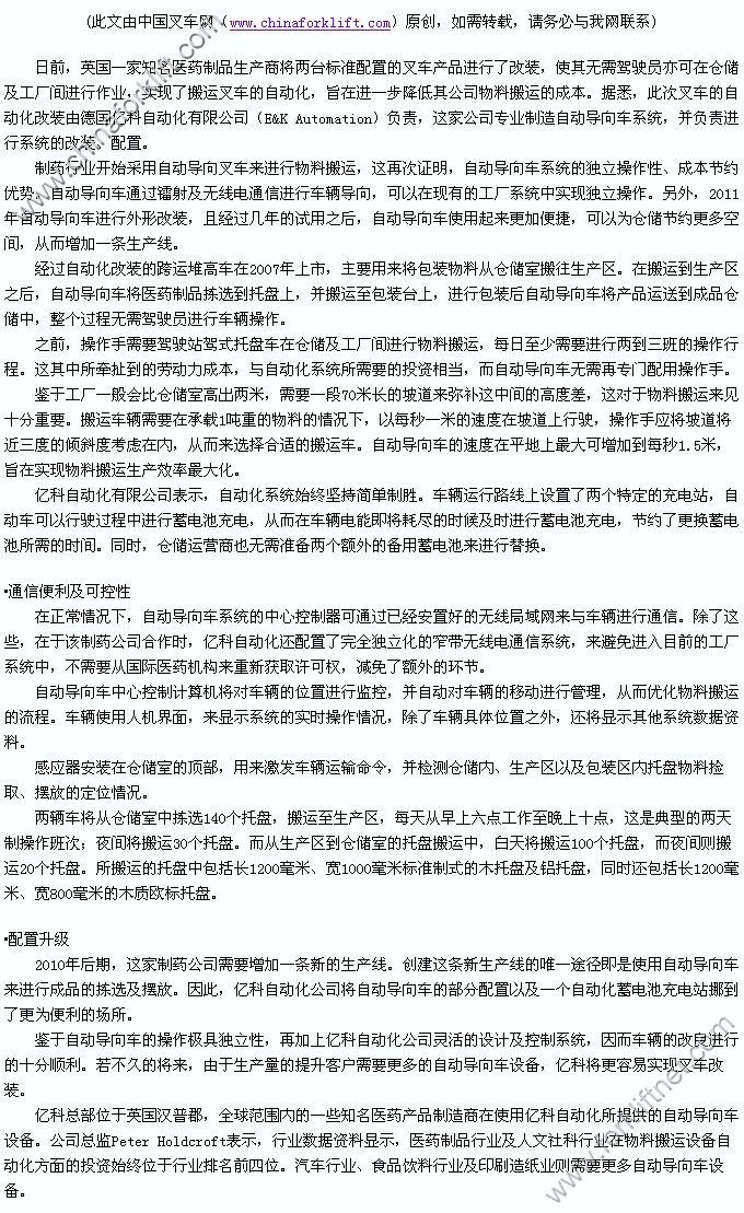 关于亿科 亿科自动化有限公司(E&K Automation)是一家欧洲领先的自动导引车供应商。 E&K拥有超过40年的经验,已安装1000个自动化系统,并在全球交付近7000 辆自动导引车。我们的制造执行系统,MES- CON OS使自动化程度增强,并能控制和改善几乎所有的工业过程自动化。 E&K自动化实力强大、市场地位突出。E&K公司拥有5 家欧洲子公司,是供应自动导引车、过程控制和综合物流控制系统的真正领袖。