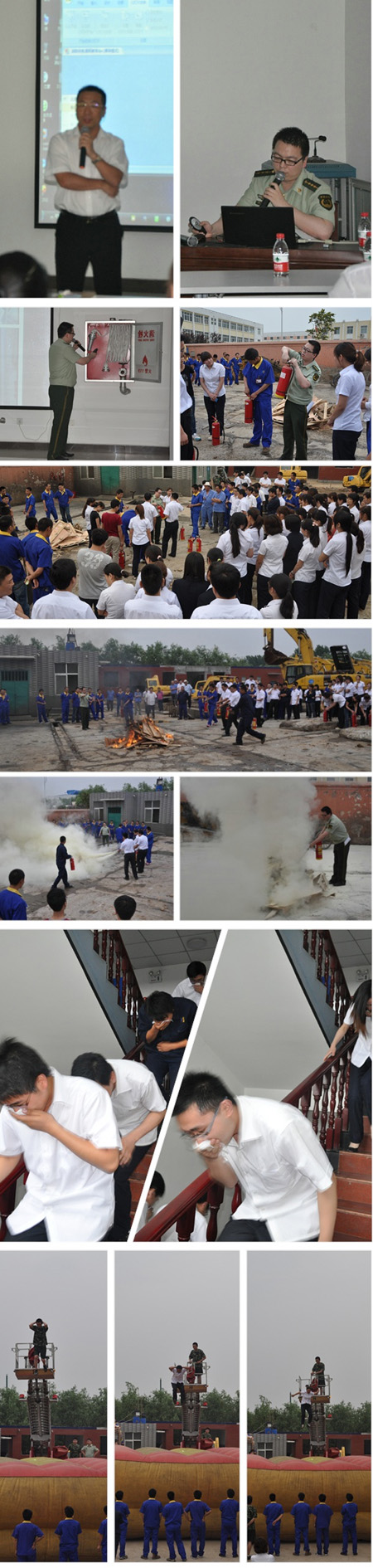 本次消防知识讲座随着史国平副总经理的致辞正式开始,首先姬阳教官全面讲解了火灾的危害、种类、预防以及逃生、自救等内容,利用PPT、视频等多媒体手段,详细分析典型火灾事件,总结经验和教训,全面系统地介绍了火灾逃生与自救的基本常识、火灾隐患的应急和预防、消防器材的正确使用及工作场所防火的注意事项。典型的案例、惨痛的教训深深震撼了每位员工的心灵,同时也敲响了大家安全防范的警钟。姬阳教官还对大家对于消防安全方面提出的问题进行了详细解答。然后,姬阳教官还在园区内指导员工们进行灭火演习,教大家如何使用干粉灭火器,最后,在专业消防教官的指导下部分员工还参与了高空云梯逃生救护演练。