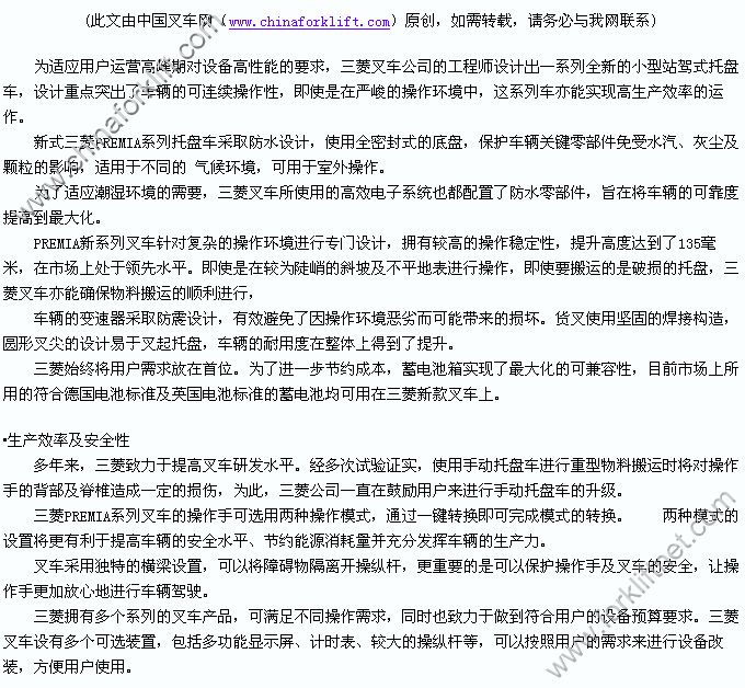 关于三菱 三菱重工和三菱卡特彼勒叉车(美洲、欧洲、亚洲),是全球最主要的叉车厂商之一,拥有数十年的叉车制造经验以及遍及世界的销售服务体系,以5万台/年以上的产量和傲视同业的卓越技术引领物流标准数十年。20年来孜孜不倦致力于支持中国叉车制造业的发展,更使之成为中国用户可信赖的合作者。在此基础上为贴近中国市场,为中国用户提供快捷高效的服务,于2004年3月24日成立菱重叉车(上海)有限公司。