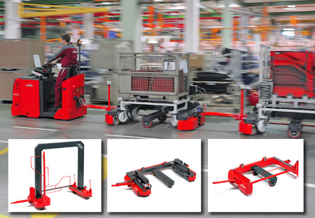 对于复杂的户外路况,具有升降系统和四轮转向的C型框架挂车则更为合适。本解决方案中,以总重量为600-2000公斤的两个集保托盘或一个欧式托盘或一个工业托盘或两个欧式托盘为组合标准。当货物重量超过1000公斤,电动液压系统有助于实现独立于每台挂车的液压功能,而这只需把一个外部电源连接到电机上。因此,叉车与叉车间的液压连接不是必需的,从而避免了泄漏。