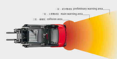 后方监测系统由两个单元组成,每个单元包括叉车后端的六个集成传感器。还有一个中央控制模块传递声光信号。集成传感器可描叉车后端区域,与汽车泊车系统类似,把后端区域分成3个平均区域。3个单独区域的尺寸可根据客户需求,通过服务工程师来调整,其射程可达9米。通过划分的3个区域,叉车司机可在任何即将发生碰撞或任何物体和人时接收到警告。 1区为初步警戒区,如果在这个领域检测到障碍,LED指示灯闪烁,驾驶室声会发出预警信号。 2区为主要警戒区,在这个区域内,LED指示灯为红色,频繁短促的预警信号将响起。在3区 - 碰撞区 - 红色LED将照亮,警告信号发出连续的声音。对于所有三个区域,行驶速度可自动降低。横向监测与后方监测一样,也具有可行性。