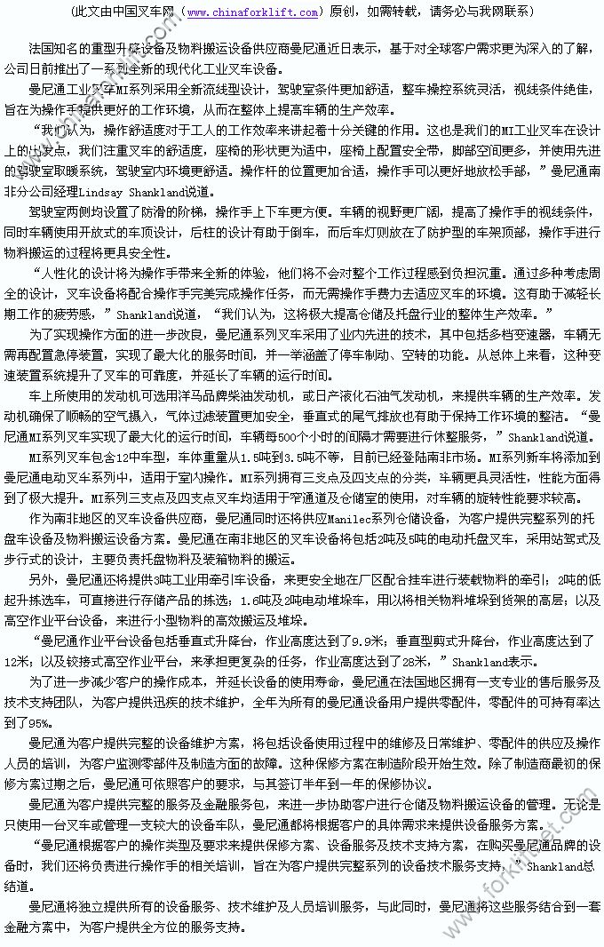 法国曼尼通(Manitou)集团成立于1956年,是法国排名第一的叉车公司,在越野叉车领域一直处于世界领先地位。是法国巴黎的上市公司,主要致力于工业叉车领域、建筑领域、农业领域三大领域的发展。曼尼通集团倡导全球化的营销理念,并一贯秉承:“让我们的客户、生产和合作者满意”的宗旨,曼尼通集团现已在全球有23个附属公司,其中17个是销售公司,5个工业性子公司,9个生产配套件基地,600个分销商,足迹遍布120个国家。曼尼通(杭州)叉车有限公司于2003年6月9日在浙江省杭州市余杭区余杭经济开发区北沙西路20号注册成立 ,是曼尼通集团在中国大陆投资的第一家独资子公司,公司注册资本540万美元,投资总额900万美元。主要生产经营1.5-3.5T内燃平衡叉车,产品销往欧洲、北美、亚洲、非洲等120个多个国家,曼尼通有着一支年轻化和专业性的团队,来自全国各地的精英汇聚一堂,朝气蓬勃,专业技术人员占员工总数的10%以上,曼尼通有着严谨和优秀的管理模式和管理理念,坚持用企业文化提升企业核心竞争力,扩大社会影响力;曼尼通有着超卓的设备,现代化的工厂规模,曼尼通以“引申我们的产品范围,扩大市场;顾客的满意度是我们至高的境界;激励我们的团队;持续有利发展”为经营理念,曼尼通人本着开拓创新的理念和敢为天下先的思想,必将拥有广阔的天空,它的发展势不可挡。