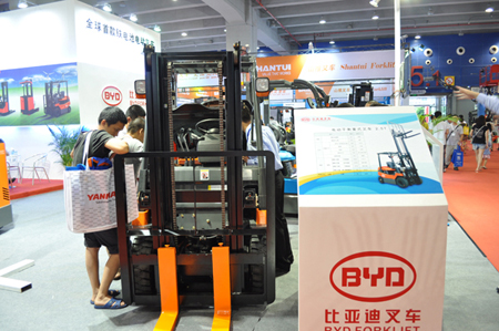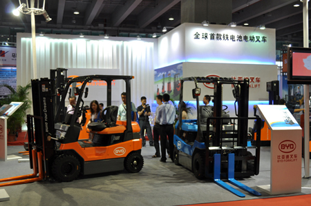 2012广州国际物流装备与技术展览会暨第八届广州国际品牌叉车及配件展览会在广州琶洲国际会展中心隆重举行,比亚迪携全系列电动叉车参加了本次展会。产品包括有:平衡重式、托盘式、前移式、堆垛式四大系列的纯电动叉车,均为首度对公众展示。期待已久的比亚迪电动叉车终于揭开了神秘的面纱。我们带着对比亚迪铁电池技术及对全球首款搭载铁电池的电动叉车的好奇,来到比亚迪展台前,一睹比亚迪铁电池电动叉车的风采。