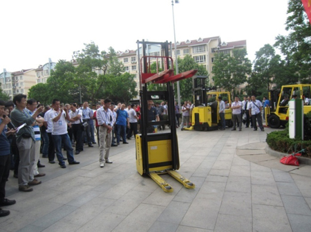 叉车演示环节在丰科售后工程师娴熟的驾驶与销售人员有条不紊的演说中进行。叉车演示赢得了客户现场的阵阵好评。有两家客户本来还在犹豫当中,看完演示后当场决定订购海斯特的叉车。青岛丰科专门订购了6台海斯特叉车用于此次会议的叉车演示。
