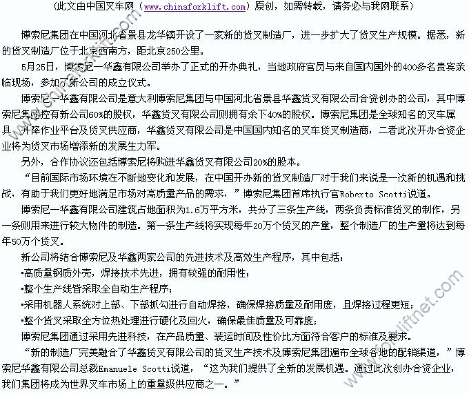 博索尼是一家意大利证券交易所上市公司,欧洲叉车属具生产领跑者,同时,也是世界及美国市场第二大叉车属具制造商。