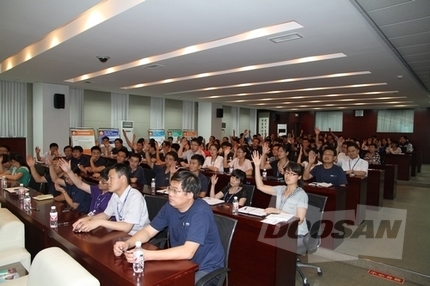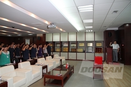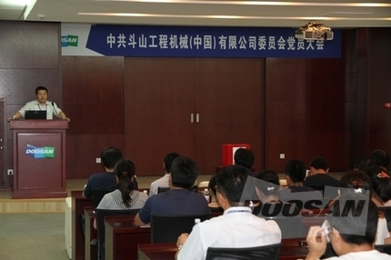 6月20日下午,中国共产党斗山工程机械(中国)有限公司第一次全体党员大会在雄壮的国歌声中开幕。来自公司各部门的95名党员参加了会议。