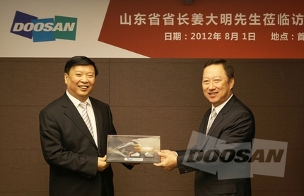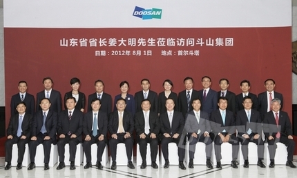 8月1日,山东省省长姜大明、省政府秘书长蒿峰、商务厅长吕在模等一行赴韩莅临访问斗山集团,斗山集团会长朴容晚、斗山Infracore金用盛社长、金在燮副社长、中国区总裁南敦斤专务等在首尔斗塔接待了省长一行。