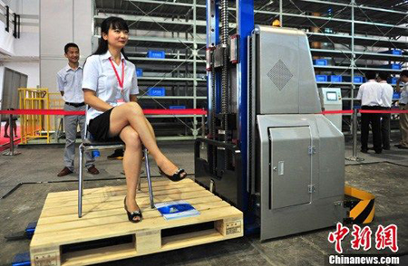 8月8月,一名来自昆明船舶设备集团的女电脑操控技术员,在北京中国国际展览中心开幕的“第五届中国国际物流博览会”上,坐在“激光导引AGV(智能机器人无人搬运车)”托板中,任由无人搬运车运转,以此表明该车自动化程度和激光定点运行的精确性。