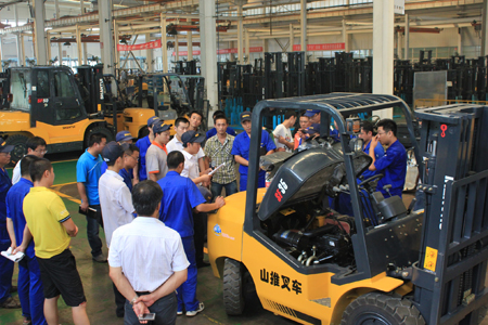 活动现场产品亲身体验环节,公司技术人员与代理商、客户之间利用分类样品车辆相互进行了不同产品结构性能的培训与讲解讨论。并邀请代理商与客户代表深入到公司生产线、检测线一线,亲身和工厂制造、检验人员一起对在制品,待检入库等产品进行了实地督导检验。既让一线员工、产品检验人员与各职能部门真正学习和了解了直接客户对产品的所求与检验方法、标准,又让客户真切的感受到了山推叉车卓越内在品质的“来源”。