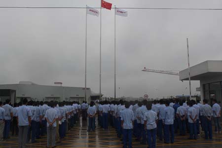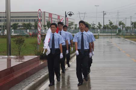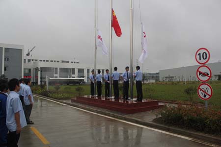 2012年9月3日晨,奇瑞叉车举行了庄严的升旗仪式。天空下着小雨,却丝毫没有减少奇瑞叉车全体员工的爱国主义热情。护旗队员精神抖擞地护卫国旗来到旗杆下,伴随着《义勇军进行曲》振奋激昂的旋律,五星红旗冉冉升起,全体员工肃然行注目礼,心中默默唱响国歌,一双双眼里露出无限自豪,一颗颗心中激荡着无限深情。