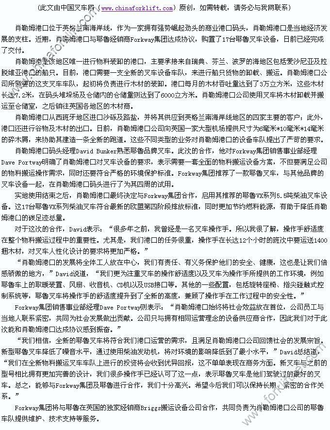 英国肖勒姆港口引入十七台耶鲁叉车设备