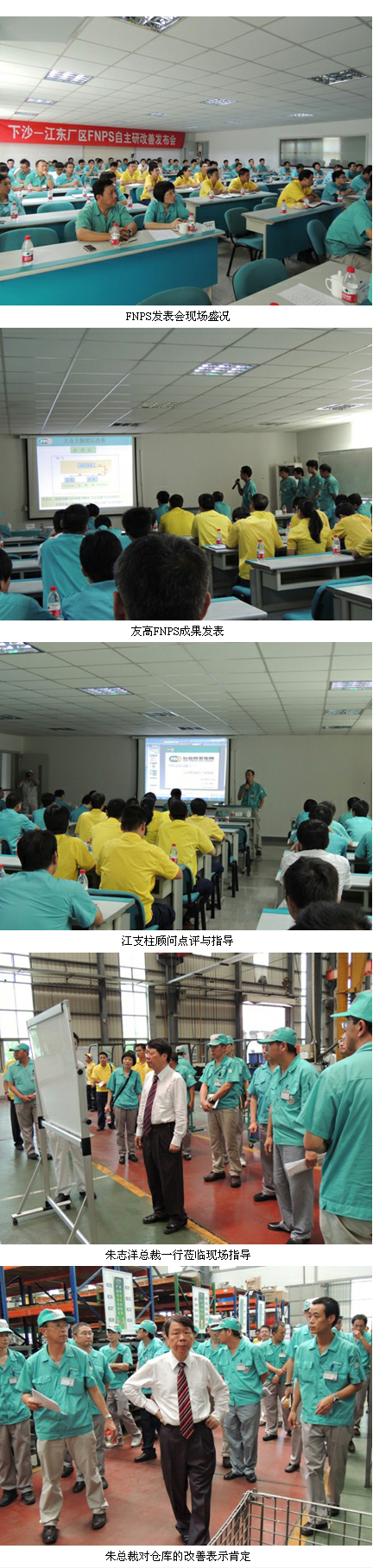 为向全球提供性能优良之产品,实现友佳叉车的营运目标,2012年8月18日(周六),下沙-江东厂区FNPS自主研改善发布会在下沙隆重举行,当天上午集团各兄弟单位中、高阶主管莅临观摩学习,互相交流分享上半年FNPS改善推进的成果。