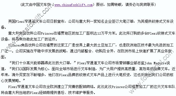 英国Flexi窄通道叉车公司拥有超过30年的提供复杂物流方案经验以确保客户最大利用储存空间进行高效搬运并节约成本。Flexi已成为世界窄通道叉车最优秀的制造者之一,公司自己设计,生产的叉车通过代理商网络行销世界,在远东与美国同一些合作伙伴签有生产与销售协议。目前公司的产品主要有一整套系列人上位、人下位窄通道叉车、拣选车、前移车。主要品牌为Flexi,这也是公司在平衡重叉车领域的全新突破。2004年2月,公司生产的窄通道叉车被叉车协会授予设计成功奖。