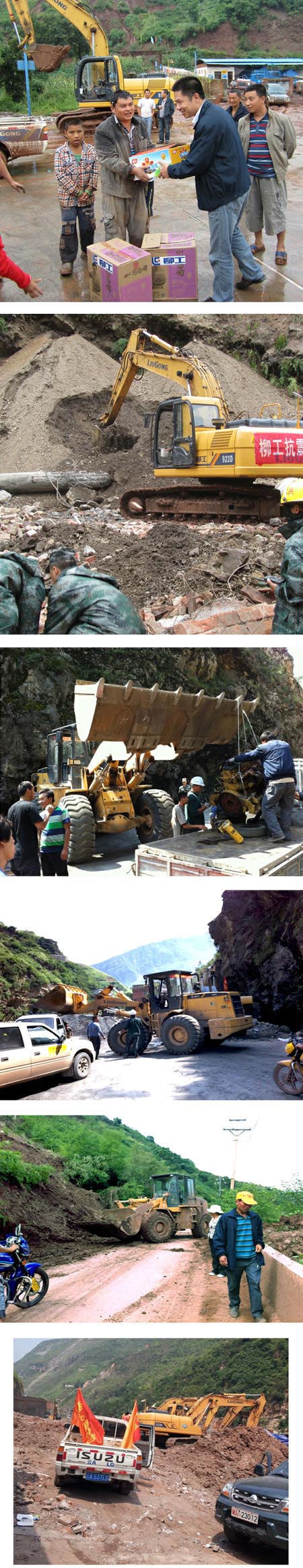 连续经历地震和洪涝灾害的彝良灾区,道路受损,交通不畅,部分村庄缺乏物资。目前,我公司已先后派出20多人、15台装载机和挖掘机,协助当地救灾指挥中心,清理疏通山体塌方受阻道路,并送去救灾物资。