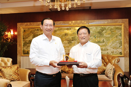 9月23日,广西柳工集团有限公司董事长王晓华在柳州市名人大酒店,亲切会见出席第九届中国东盟博览会和中国—东盟第二届(柳州)汽车、工程机械及零部件博览会的柬埔寨国务大臣兼商业部长占蒲拉西。