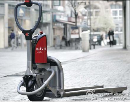 中叉网新浪微博:2011年,林德在德国汉诺威物流展上推出这款迷你型的电动托盘搬运车--Cititruck.该车最大的优点在于:最大行驶速度达6KM/H,负载提升速度为0.049M/S,升高达125mm.负载时最大爬坡能力为8度.最大载重量为500公斤.该车还配有紧急断电开关和电磁盘式制动器装置,操作简易方便.这款车,无疑是轻量化搬运的利器.