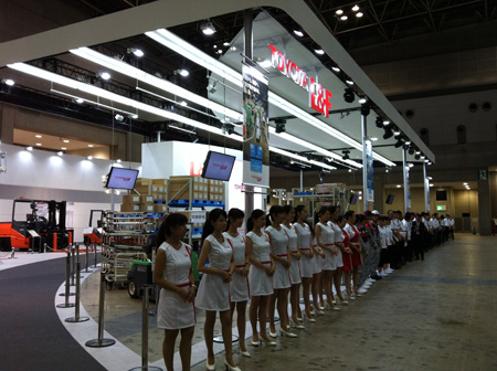 作为世界排名第一的叉车制造,也是日本国内物流设备制造行业的领头羊,相比聚焦于“新品”的其他制造商,丰田自动织机的此次出展以更高的使命感和责任感,着眼于震后日本物流产业的复兴,以“为客户改善现有的仓储物流作业”为主题,在展位上运用更多的篇幅再现了“大宗货物保管现场”、“中型货物拣选现场”、“小物品拣选出货现场”、“零部件运输补给现场”等4个物流改善现场,在整点演示中,演示人员通过实际演示和影像放映逐一介绍了在这4个改善实例中,丰田是如何通过基于TPS理念的现场改善提案和最适化物流设备提案,来帮助客户实现兼顾保管效率、作业效率和管理效率的“三位一体”的最理想化物流现场,充分展示了丰田叉车在物流改善硬件和软件上的强大综合技术实力。