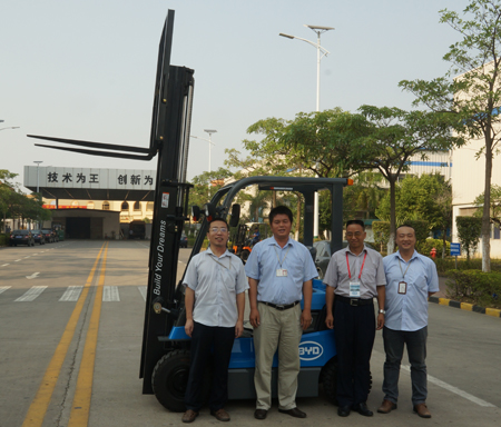 比亚迪作为全球电动汽车的领导者,是全球少有的掌握了动力电池、电源管理、电控、电机等电动车核心技术的企业。比亚迪最为核心的铁电池技术已经成功应用于比亚迪纯电动汽车e6和纯电动大巴K9,其中e6单车最高行驶里程已超过20万公里,品质得到了市场的检验。基于电动汽车的巨大优势和近年来国际物流行业的蓬勃发展趋势,比亚迪于2010年毅然进军叉车行业,推出了全球首款搭载铁电池的电动叉车,完成了比亚迪在新能源产业的又一巨作。经过两年的技术储备及研发,比亚迪已经成功研发出搭载铁电池的平衡重式、托盘式、前移式、堆垛式四大系列的纯电动叉车,并具备了一定的生产规模。一期工程在惠州工业园已建成年产量达2000台的电动叉车生产基地。二期工程已规划2万平方米作为电动叉车生产基地,预计2013年投产,届时年产量将达到20000台。