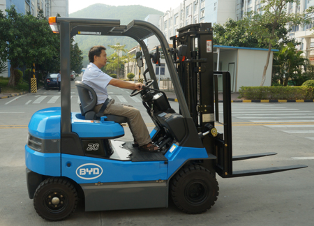 叉车司机正在演示比亚迪铁电平衡重叉车性能