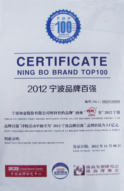 11月上旬,公司“西林”品牌在“2012宁波品牌百强”评榜活动中被评为“2012宁波品牌百强”,品牌价值为3.5亿元。
