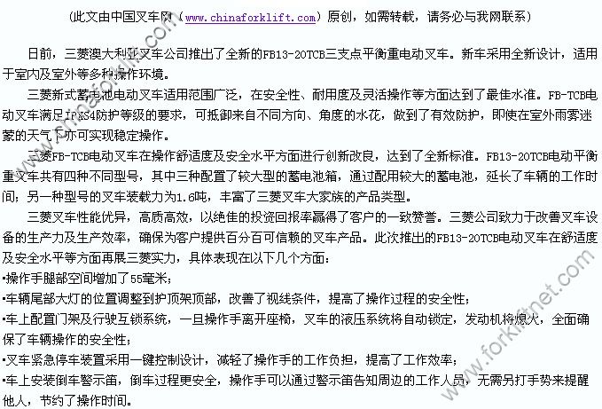 三菱全新电动叉车适用于各种操作环境