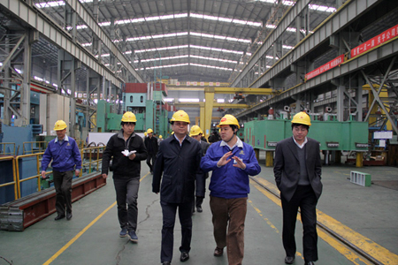 在生产车间,张庆军市长一行参观了大型液压机部件加工以及装配调试生产线,饶有兴致地观看了我公司大型高端液压机的装配调试情况,不时地与公司有关人员进行交流,称赞生产技术先进。