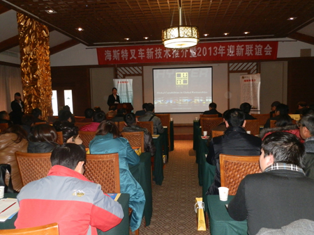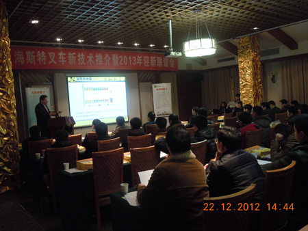 2012年12月22日,由海斯特中国和武汉力夫特联合举办的“海斯特叉车新技术推介暨2013年迎新联谊会”在湖北赤壁龙佑温泉度假区如期召开,与会人员近80人。参加本次会议的嘉宾来自湖北各地区、各行业的海斯特叉车重要客户单位。海斯特中国十分重视此次活动,总经理梁锦鸿先生携中区销售经理王先生、技术支持邓先生亲临活动现场。