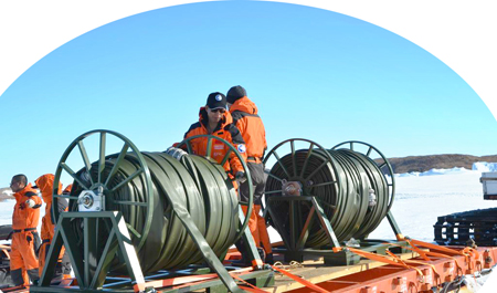 由于每年的11-12月份是南极的初夏时期,海面上的浮冰很多,且距离中山站越近海面上的浮冰越厚。雪龙号在距中山站约15海里的地方时,因无法再进行破冰而停止了前进。船上的工作人员开始了紧张的物资转运工作,将今年中山站、昆仑站所需的生活、科考和建筑物资从船上运送到中山站区。运输的方式是以直升飞机吊运和雪地车拉着大型雪橇在海冰上运送,燃油则是以铺设管道加三级增压泵站的方式进行。不论是雪地车运送还是管道输送,都是在海冰上进行的。