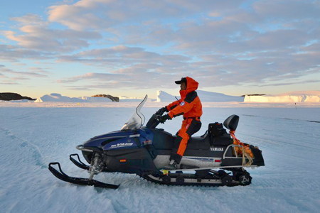 此时的南极处于极昼时期,站区时间7:00-19:00最高温度能达到4°C,19:00—7:00则降至零下4°C。海冰运输都选择在气温较冷的时间段进行,以保证车辆和物质的安全,加上海冰面的情况比较复杂,给卸货工作带来不小的困难。因此,我只能利用所谓的“白天”时间在站内用装载机、叉车和挖掘机等车辆机械,协助队员们对到站物资进行疏散转移,并对一台推土机和一台25吨的起重机进行了维护和保养,使得这两台机械能够参与到卸货工作中。此外,我还利用空闲时间熟悉和掌握了雪地车和雪地摩托车的操作和驾驶。晚上则跟随海冰运输队,轮班驾驶雪地车,在中山站区和雪龙号之间运输物资。廖焕敏则是全天候跟随探冰队驾驶着雪地摩托车在茫茫的海冰面上进行海冰运输道路的选择与更改,为夜间的海冰运输和输油管线的铺设提供安全保障和输油管路的安装与维护。