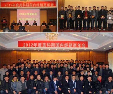 会议期间,浙江工业大学经贸管理学院副院长杜群阳教授为参会人员讲解了“当前中国宏观经济走向及行业形势分析”的专题报告,美科斯高层回顾了2012年度的行业现状及来年展望,通报了美科斯业绩和二期扩建项目进展,并公布了2013年度的公司计划目标,向参会经销商(代理商)介绍了明年即将上市的新系列A型及新产品,令参会人员信心百倍,纷纷表示将全力以赴实现来年的计划目标。美科斯高层分别为2012年度获得优秀经销商奖、优秀服务奖的经销商颁奖,部分获奖经销商代表上台发言并承诺在2013年努力把市场做好以完成更好的业绩。