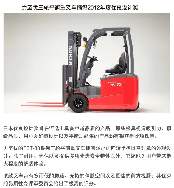 力至优三轮平衡重叉车摘得2012年度优良设计奖