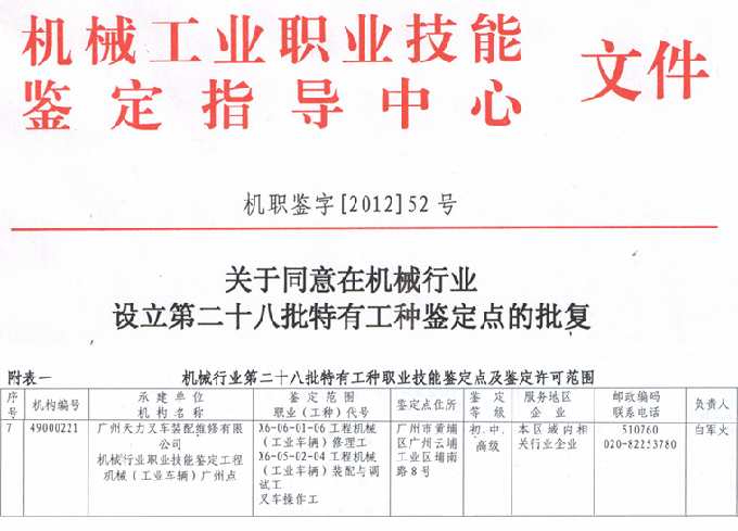 热烈祝贺广州天力叉车装配维修有限公司获批设立国家“机械行业职业技能鉴定工程机械(工业车辆)广州点”!我司将迅速开展职业技能培训及职业技能鉴定工作,为国家人力资源规划和发展做出应有贡献,为广大工程机械(工业车辆)行业的从业人员提供帮助。