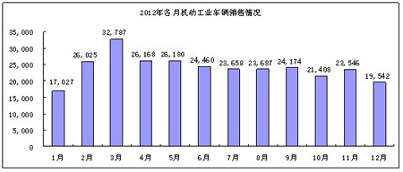 根据中国工程机械工业协会工业车辆分会统计:机动工业车辆制造企业共销售288,662台,与2011年同期的310,189台相比,下降了7%;非机动工业车辆销售量为1,564,066台,与上年同期的1,686,031台相比,也下降了7%。2012年机动工业车辆各月销售情况见下图: