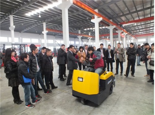 图1:与会代表参观了卓一工厂的制造现场,并认真听取技术总监姚海进现场做的《卓一新品和新技术》的报告,图为新品之一的卓一4吨搬运车
