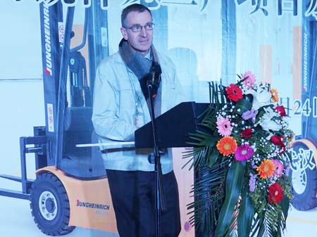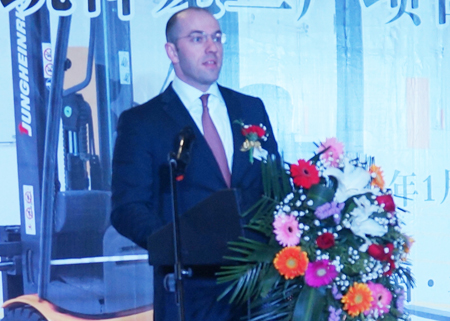 随后,永恒力叉车(上海)有限公司总经理欧亚雷先生在仪式上致辞,他对到场的来宾表示感谢,在提到与东风捷富凯的合作,他认为本次的项目要求很严格、标准也很高。东风捷富凯对物流设备要求和与神龙三厂的组织构架,永恒力的产品和服务是最合适的。本次合作我们不仅仅是客户和供应商的关系,更多的是合作伙伴的关系。我们很有信心做好本次项目合作,永恒力努力发展差异化的服务,让我们的服务与众不同,才能做的更好。我们的目标是用最少的运营成本来达到最高效的效率和实现最大的收益。永恒力也将投入优质的资源和领先的技术来支持项目的高效运营,本次合作模式也将成为永恒力发展中的一个模版,在将来为更多客户提供类似的服务。让我们共同携手发展,期待未来的合作将更加美好!